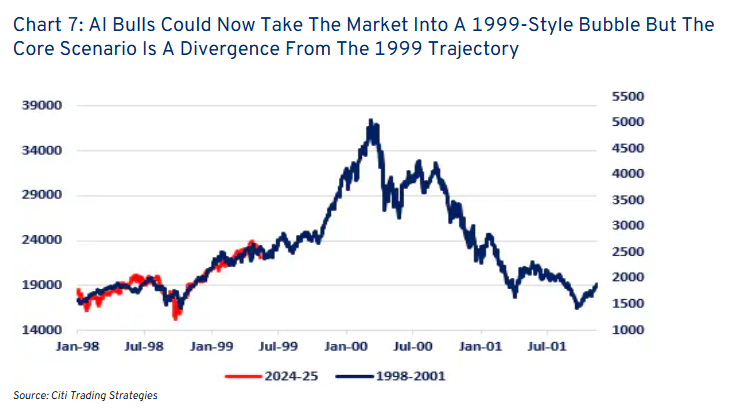 这是一个至关重要的拐点,AI 多头必须进场买入。如果他们真的相信AI的热潮,并选择大举买入,那么我们可能会在此处看到类似 1999 年那种“非理性泡沫(irrational bubble)” 的发展。然而,这并不是我们的基准情形(base case)。与 1999 年相比,如今的市场情景及市场结构都完全不同。